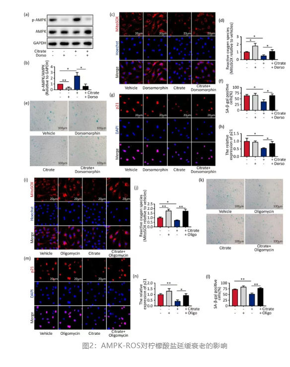 与年轻细胞相比,衰老细胞中的柠檬酸盐含量显著降低。研究人员发现,外源性补充柠檬酸盐能够恢复衰老细胞中降低的柠檬酸盐水平,延缓内皮细胞衰老并减轻衰老诱导的线粒体功能障碍。在机制方面,柠檬酸盐能够通过激活 AMPK 信号通路,提高线粒体呼吸效率和ATP产量,降低ROS水平,增强线粒体自噬与更新,从而改善衰老内皮细胞的能量代谢活性。这一结果表明,柠檬酸盐能够通过 AMPK-ROS 信号级联延缓内皮细胞衰老。