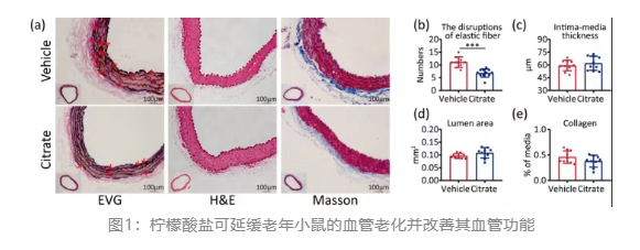研究结果显示,长期补充膳食柠檬酸盐能够显著延缓血管衰老并改善血管功能。在老年小鼠模型中,持续饮用 1% 柠檬酸钠的小鼠较对照组表现出更为完整的血管结构特征,包括弹性纤维断裂减少、内膜-中膜厚度减小、管腔面积增大以及胶原沉积下降,这表明柠檬酸盐可延缓与年龄相关的血管老化(图1)。