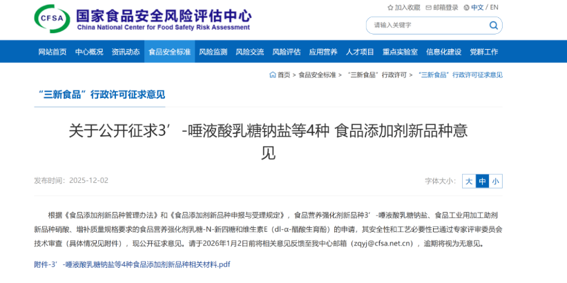 2)2025年11月24日,国家卫生健康委员会政务服务平台发布索马甜(发酵法)、(6S)-5-甲基四氢叶酸,单钠盐作为食品添加剂新品种的受理情况公告。(来源:国家卫生健康委员会政务服务平台)