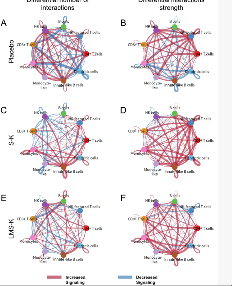 图1:九种主要免疫细胞群干预前后的变化(安慰剂组( A、B)、SK组(C、D)和LMS - K组( E、F ))