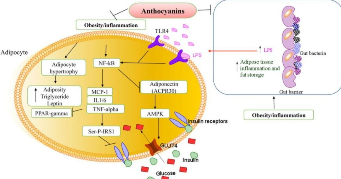 花青素的发酵有助于短链脂肪酸的产生,主要是乳酸、乙酸、丙酸和丁酸。这些脂肪酸不仅为肠道细胞提供能量,还能通过调节细菌毒力基因表达和降低结肠中管腔pH值来抑制肠道病原体如沙门氏菌、大肠杆菌和李斯特菌的入侵。短链脂肪酸在肠道生理事件中发挥着重要作用,如获取能量、调节pH、参与肠脑轴和保护肠道屏障功能。花青素对肥胖相关炎症和肠道菌群变化的保护(Molecular Nutrition Food Research)